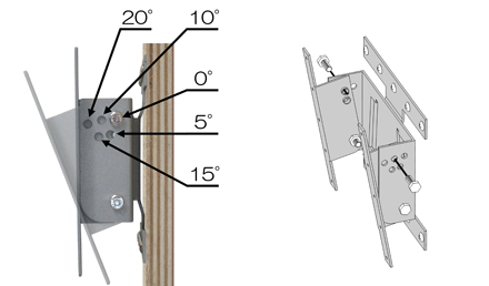 ●角度なし〜最大傾斜角度20°まで5°間隔で5段階の角度調整ができます。 ●お好みの角度の穴に付属のボルトでしっかりと固定して角度を調整してください。 ※実際の稼動範囲は取り付けた液晶テレビの大きさや取り付ける壁の位置などによって、制限される場合がありますのでご注意ください。