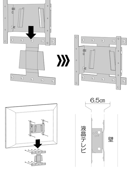 ●液晶テレビ背面に取り付けた金具を、壁側の金具に差し込んで角度を調整して使用してください。 ※壁から液晶テレビ背面まで:約6.5cm(平行状態)